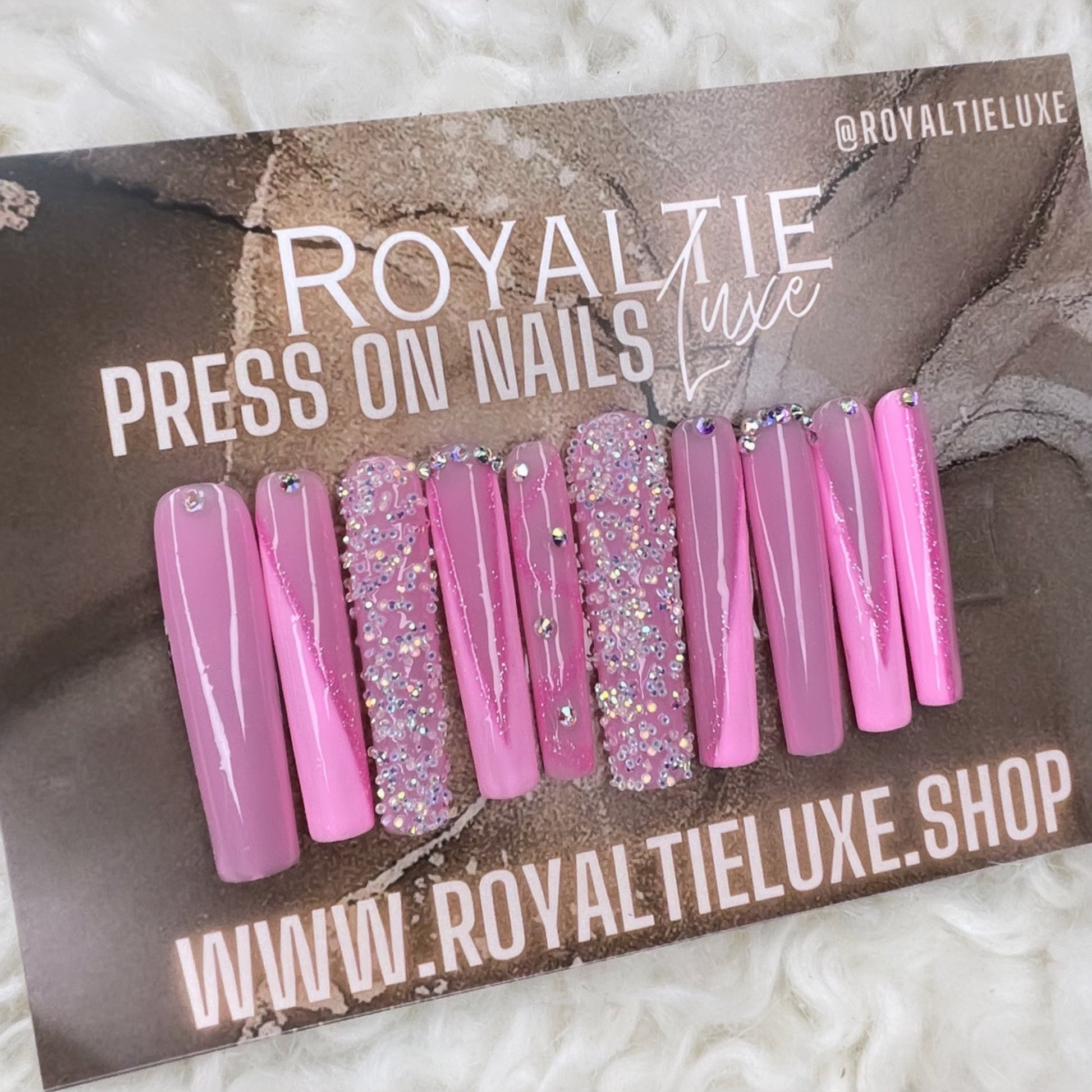 Extra Long Square Pink Designer Press On Nails With Crystals